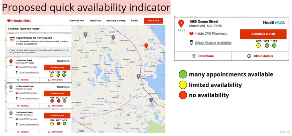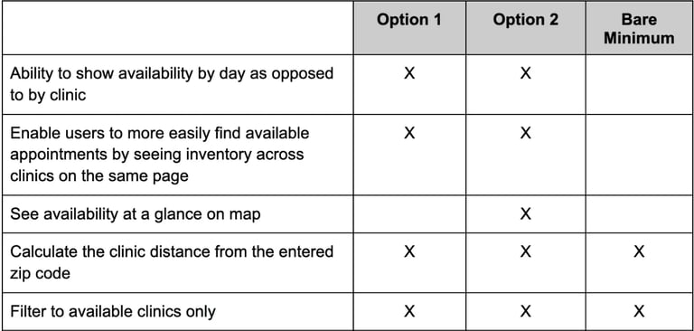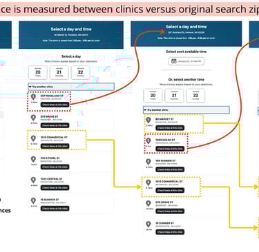 This option provides greater user value by surfacing clinic availability more visually and earlier. While it would be ideal to continue to build on the vaccine flow (option 1), the map visual could be a standalone feature.