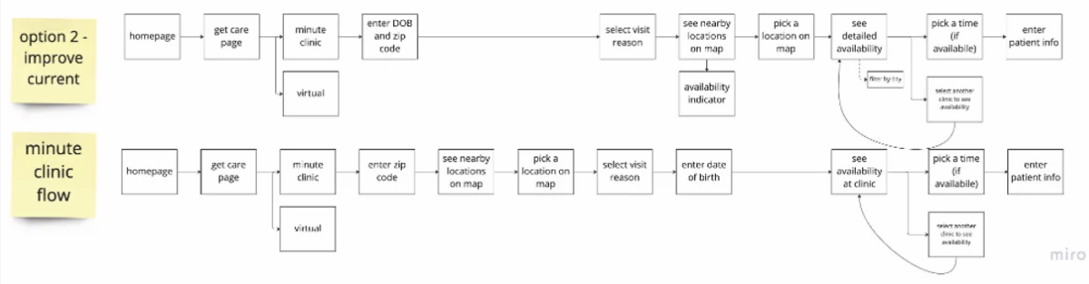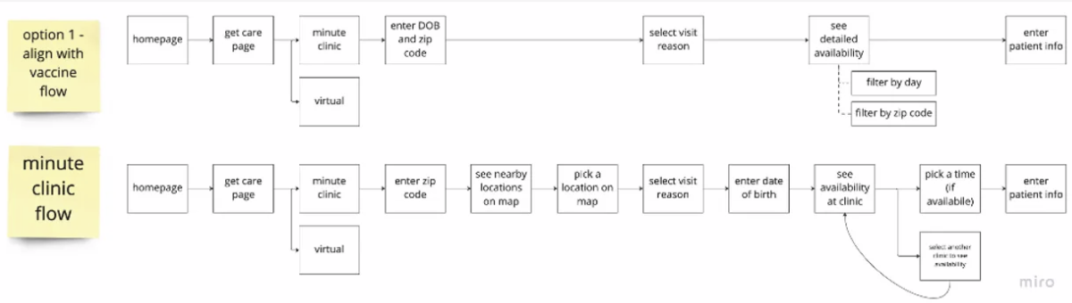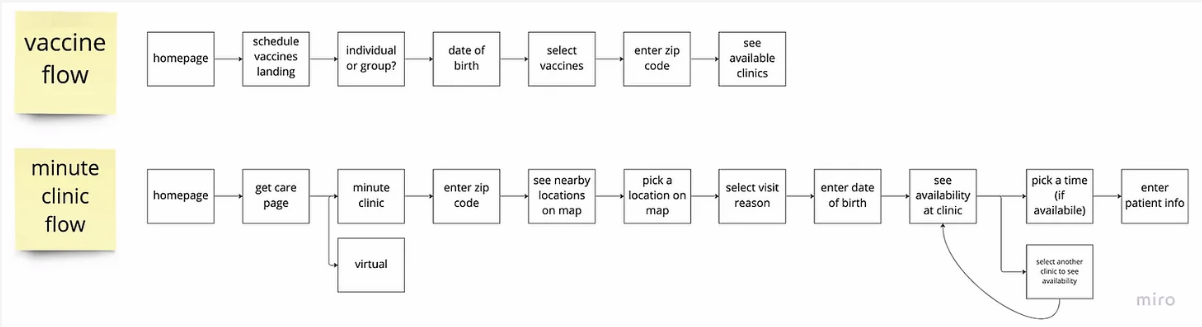 The CVS retail health model has a few different starting points. There is validity for modified flows based on staffing and regulations. However, the lack of consistency across experiences creates unnecessary and disruptive friction. The greatest opportunity for streamlining exists in the MinuteClinic flow.