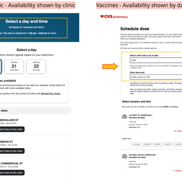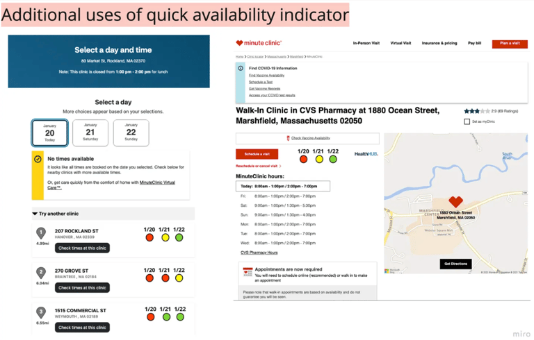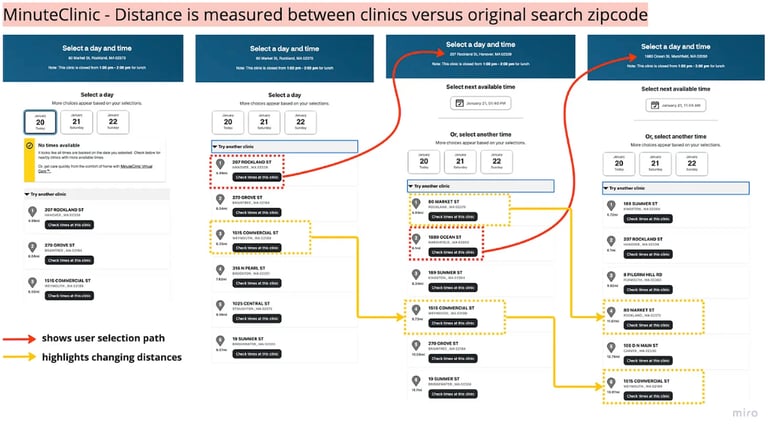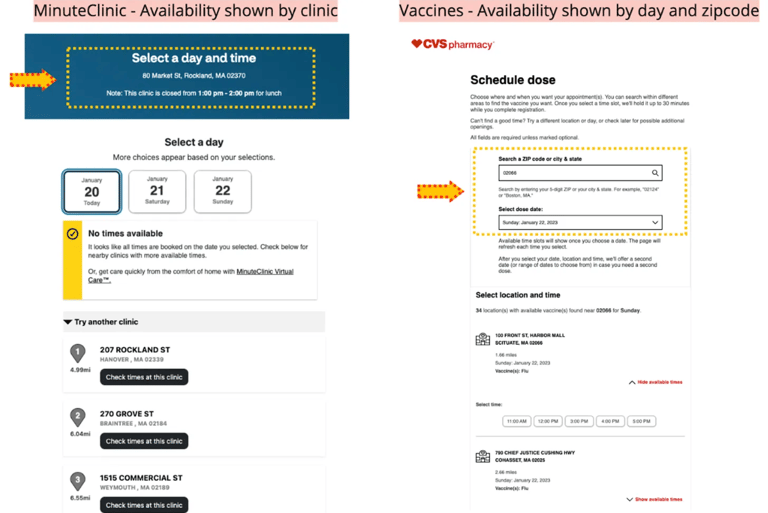 The primary challenges with the existing experience are that it is challenging to find the soonest available appointment near a location. This is a use case that has been addressed with the vaccine intake flow. It is a bit perplexing why a similar intake experience is not consistent across the digital experience. It is potentially likely that the vaccines and MinuteClinics have different regulations and staffing resources databases, however that does not seem to be enough for the friction.
