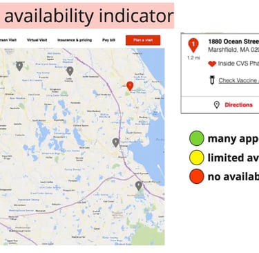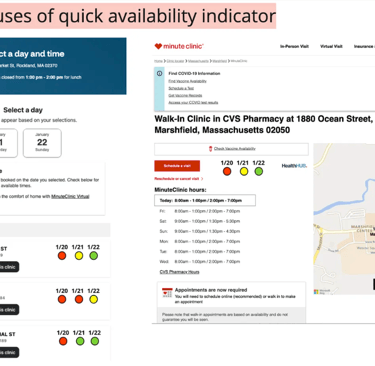The availability indicator could act as a component to be leveraged across the site experience. MinuteClinic appointments are generally available for no more than 2 days ahead. Users that are looking for clinic availability generally have a feeling of urgency. Do they need to see someone now/today? Or can it wait up to 48 hrs? The stoplight style icons provide immediate insight.